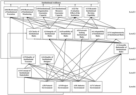 We stratify the institutional resilience influences according to The first identified set of factors is located at the top level of the structural model, then the rows and columns corresponding to the factors in are removed from the original accessible matrix P to obtain the new matrix. The same operation is performed on the new matrix to determine the next top-level factors of the structural model. Repeat the above steps to obtain all levels of the structural model, ; ; . Based on the above calculations and analysis, a model of the formation mechanism of the factors influencing institutional resilience is constructed, as shown in the Figure 3.