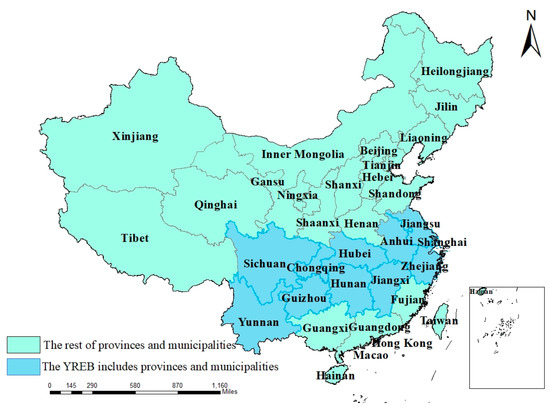 Based on current research, both industrial agglomeration and environmental regulation have a certain impact on environmental pollution and carbon emissions. Therefore, this study on the relationship between these three factors is of great significance for the current research system and the implementation of dual carbon policies. In addition, this article has the following innovative points in the research process: firstly, in terms of research content, the article studies the impact of industrial agglomeration and environmental regulation on carbon emissions from a dual perspective, expanding the analysis of factors affecting carbon emissions. Secondly, in terms of indicator selection, this article combines the experience of scholars and adopts comprehensive indicators for measurement, making the data more authentic and stable. Thirdly, in terms of research objects, the research object of the article is the important strategic development region of China—the Yangtze River Economic Belt (YREB) (Figure 1). The YREB spans the three major regions of east, west, and central China and is one of the three major strategies implemented by the central government. It is a globally influential inland economic belt, a coordinated development belt for interaction and cooperation between the east, center, and west, and a comprehensive opening belt for both domestic and foreign development along the coast, rivers, and borders. It is also a leading demonstration belt for ecological civilization construction [15,16]. Therefore, conducting research on it has certain representativeness and can provide certain guidance for carbon reduction in China.