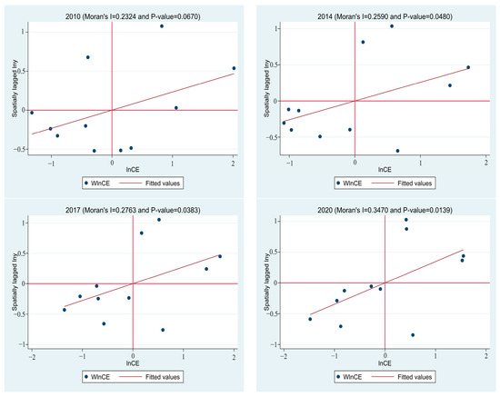 As can be seen from Table 4, the Moran index of the carbon emission level of the Yangtze River Economic Belt from 2010 to 2020 is positive and significant at the level of 10%, indicating that the carbon emissions in the Yangtze River Economic Belt are not independent of each other, but affected by the surrounding areas, and there is a positive correlation. The Moran index has been on the rise since 2010, which indicates that the spatial correlation is gradually increasing. In order to observe the spatial autocorrelation of carbon emissions more intuitively, scatter plots of 2010, 2014, 2017, and 2020 are depicted in Figure 2.