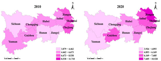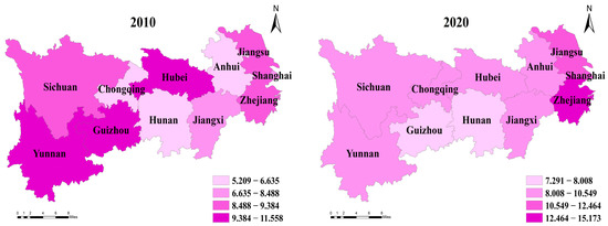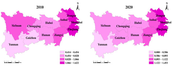 According to the final data collection results, this paper uses ARCIS 10.2 to draw spatial–temporal evolution maps for the industrial agglomeration, environmental regulation, and carbon emission levels in 2010 and 2020 (Figure 3, Figure 4 and Figure 5), respectively, and makes an intuitive analysis.