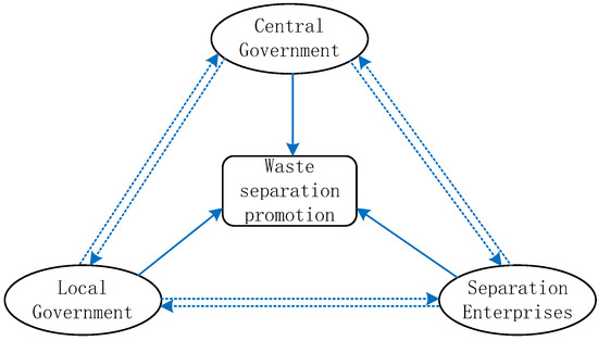 This study analyzes the roles of the central government, local government, and separation enterprises in the promotion of waste separation. The relationship between these three stakeholder groups in this area is continually evolving (see Figure 1), which can be well revealed by the evolutionary game research method. Finally, the process of jointly promoting the goal of waste separation is achieved.