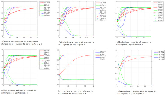 Figure 2e shows that with other parameters unchanged, the initial willingness (y, z) of both local government and separation enterprises is high, even when the initial willingness of the central government is low, i.e., x, y, z will converge to 1, with all three parties participating in waste separation promotion; when the initial willingness (y, z) of both the local government and separation enterprises is low, even when the initial willingness (x) of the central government is high, x will converge to 1, while y and z will converge to 0. The simulation results show that when the central government’s participation in waste separation promotion is weak, the central government’s participation or non-participation has little influence on the local government and separation enterprises’ participation in waste separation promotion. Market factors affect the willingness of separation enterprises, and the willingness of local governments is more influenced by the central government. At the local level, when the central government’s support is not sufficient, but the local government’s willingness to participate in the waste separation promotion is good, the enterprises will choose to participate in the waste separation promotion. When the local government’s willingness is not strong enough to obtain the expected benefits, the enterprises’ willingness to participate will decrease, and they will not participate in the waste separation promotion.