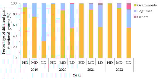 All plant species in each slope in the investigation are listed in Table A1. According to the division of plant functional groups, the plant species in the plot community were divided into three functional groups: graminoids, legumes and other species []. The plant community species composition of each plot under different planting densities was dominated by graminoids and legumes, both of which accounted for more than 85% of the total, and other species showed an upward trend (Figure 2). With the increase in the recovery time of the slope community, the proportion of grasses under the HD treatment gradually increased, accounting for approximately 99.76% after three years, and legumes only accounted for 0.24%; the proportions of grasses and legumes under the MD and LD treatments first increased and then gradually stabilized. At the same time, other species, such as Artemisia gmelinii Web. ex Stechm. and Leontopodium leontopodioides (Willd.) Beauv., appeared. Among them, the proportion of other species was the highest after three years of LD treatment, reaching 11.44%.