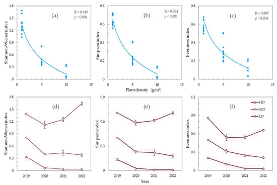 Changes in the community diversity indices of the plots under different grass planting densities. Note: (a) represents the relationship between the Shannon-Wiener index and planting density; (b) represents the relationship between the Simpson index and planting density; (c) represents the relationship between the Evenness index and planting density; (d) represents the Shannon-Wiener index with recovery change in years; (e) represents the change in the Simpson index with recovery years; (f) represents the change in the Evenness index with recovery years.