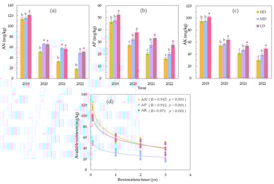 Variation in soil nutrients in the plot under different planting densities of Poaceae species. Note: (a) represents available nitrogen; (b) represents available phosphorus; (c) represents available potassium; (d) represents the change in soil-available nitrogen, available phosphorus and available potassium with recovery time. Different lowercase letters in the same year with different planting densities indicate significant differences (p < 0.05).