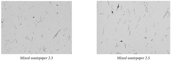 Surprisingly, in none of the cases under consideration do the white and mixed wastepaper show any differences with each other, which proves the heterogeneity of the raw material. The secondary raw material used in the research was characterized by high variability. Some bales of white wastepaper subjected to analysis exhibited a raw material that should be described with a different variety. In addition to the 3.04 variety, there are also 3.02 varieties, i.e., mixed shreds of printing and writing papers, slightly colored in mass, containing a minimum of 90% of wood-free paper; 3.03, i.e., bookbinding scraps made of wood-free paper, slightly printed, with glue, without paper dyed in mass. However, the range of variation in the quality of wastepaper has been determined in other studies [47] and this was not the purpose of this publication. However, the lack of precise requirements in paper mills as to the quality of secondary raw material could cause difficulties in obtaining unambiguous correlations and dependencies and contribute to the fact that no significant differences were obtained in the characteristics of white and mixed wastepaper fibers, which clearly indicates the need to control the quality of recycled raw materials in paper mills before will go into the production process.