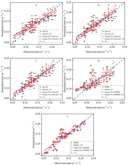The linear relationship between the measured value of the stomatal conductance and the calculated value is shown in Figure 3. The estimate of the –ΔT model was closer to the measured value, and the model performed well. The modified Jarvis model performed better than the modified BWB model (Table 5). In the Jarvis model, the R2 of the Jarvis1 model was maximum, while the R2 of Jarvis2 and Jarvis3 was greater than that of Jarvis1 after the introduction of ΔT. Compared with the initial model, the performance of the modified Jarvis model was improved, and R2 was improved by 26.03% (Jarvis1), 38.44% (Jarvis2) and 32.01% (Jarvis3). RMSE decreased by 29.87% (Jarvis1), 41.70% (Jarvis2) and 40.55% (Jarvis3). In the BWB model, R2 increased from 0.434 to 0.8178 and RMSE decreased from 0.0317 to 0.0185 after removing the relative humidity factor in the BWB1 model. The introduction of ΔT improved the R2 of the BWB model by 40.99% and reduced the RMSE by 20.50%, while the R2 of the BWB1 model improved by only 2.81% and reduced the RMSE by 7.57%.