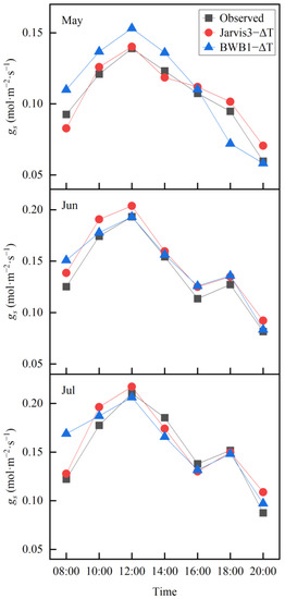 The Jarvis3–ΔT model and the BWB1–ΔT model with better model performance were selected to simulate the daily change in stomatal conductance (Figure 4). Both models overestimated stomatal conductance during the critical period of grape growth. The estimates of the Jarvis3–ΔT model were 1.89% (May), 7.77% (June) and 2.93% (July) higher than the measured values. The estimates of the BWB1–ΔT model were 5.27% (May), 5.57% (June) and 3.04% (July) higher than the measured values. Overall, the estimated value of the Jarvis3–ΔT model was closer to the measured value than that of BWB1–ΔT model, which could better estimate the daily change in the stomatal conductance of grape leaves in the extremely arid region.