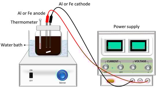 The EC experimental set-up was selected based on the study of Papadopoulos et al. []. A glass electrolytic cell with a total internal volume of 0.6 L was used as a batch reactor (Figure 1). A pair of Al or Fe electrodes, consisting of one anode and one cathode, were placed vertically in the EC reactor and connected in monopolar parallel mode to a DC regulated power supply (model QJ3005C). The dimensions of the electrodes were 10 cm (length) × 2 cm (width) × 0.005 cm (thickness), and the total effective surface area was 12 cm2. To reduce energy consumption, the inter-electrode distance was kept low at 0.30 cm [].