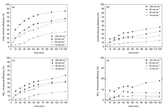 The effect of current density and electrode material on color, NO3−-N, NH4+-N and d-COD removal efficiency from the SLL was investigated at current densities in the range of 10 to 100 mA cm−2 using Al (Figure 2a–d) and Fe (Figure 3a–d) electrodes. It is obvious that color, d-COD, NO3−-N and ΝH4+-Ν removal efficiency increased with increasing current density, reaching values up to 84.70 ± 0.94%, 46.64 ± 0.07%, 58.62 ± 0.15% and 18.61 ± 0.08% for Al (Figure 2a–d) and up to 86.28 ± 1.29%, 47.37 ± 0.59%, 59.81 ± 1.64% and 7.38 ± 0.12% for Fe (Figure 3a–d) electrodes, respectively, after 120 min of treatment.