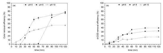 Figure 4b,c show that d-COD and NO3−-N removals decreased with increase in the pH of the SLL from 6 to 10. In particular, the highest d-COD and NO3−-N removals were attained at pH 6 after 120 min, reaching values of 39.62 ± 0.84% and 59.86 ± 1.28%, respectively. As reported in the literature, this phenomenon can be attributed to the fact that, under acidic conditions, the solubility of humic acids is lower, and therefore the precipitation of humic acid solids may be higher, contributing to the amelioration of the d-COD removal efficiency [,]. A similar COD removal tendency was also presented by Yadav and Dikshit [], who used an Fe electrode pair to treat LL under the same range of pH values (6–10); they reported that the optimum COD removal efficiency (56%) was also obtained at pH 6, at a current density of 46.6 mA cm−2 for a 90 min electrolysis time. Regarding NO3−-N (Figure 4c), a delayed removal efficiency was observed at pH values of 6 and 8, suggesting that the NH4+-N presented in the SLL was partially converted into NO3−-N at the anodic Fe electrode, when the current intensity was applied [,], as was mentioned above.