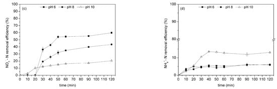Effect of pH on (a) color, (b) d-COD, (c) NO3−-N and (d) ΝH4+-Ν removal efficiencies (raw SLL, Fe electrodes, current density: 30 mA cm−2, pH: 6, 8 and 10).