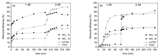 Performance of (a) ADzeo-EC and (b) EC-ADzeo hybrid systems in terms of color, d-COD, NO3−-N and ΝH4+-Ν removal efficiencies (raw SLL, Fe electrodes, current density: 30 mA cm−2, pH not adjusted).