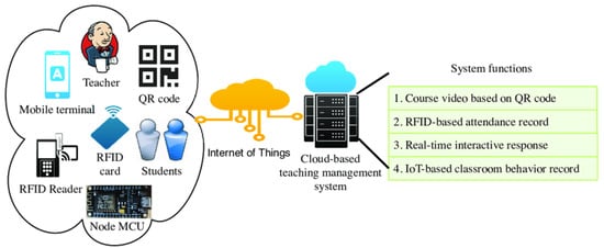 During a pandemic, such as COVID-19, AI and the IoT in sustainable education can be utilized to enhance students’ learning opportunities. For instance, chatbots powered by AI may be used to answer inquiries from students and offer them individualized learning experiences [3]. IoT tools may be utilized to track students’ development and give teachers feedback. Additionally, students with special needs and impairments can benefit from the employment of AI-powered virtual assistants. Industrial IoT and AI capabilities can also be utilized to provide students and patients with individualized feedback and guidance [4]. A similar system was used in healthcare during the pandemic of COVID-19, and thus, the same can be replicated to enhance education. Figure 1 shows an IoT-based education system that connects teachers and students through a cloud-based teaching system, allowing the students to learn remotely using their IDs based on RFID and mobile devices. This enables teachers to easily track learners and the process remotely.