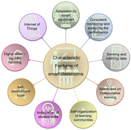 AI has been greatly studied in studies from the past decade, increasing the interest in future applications in smart cities, as the data collected by integrating the software systems can be used to organize capital, resources, and energy more efficiently. While entering into a digitalized era, a notable increase in the application of AI and the IoT can be observed. Numerous applications of AI in smart city operations have been implemented so far, such as advanced computing, neural networks, fraud detection, sensing technology, speech recognition, and human–computer interface software [10]. In addition to these general applications of AI and the IoT, specific applications were greatly influenced due to the COVID-19 pandemic [12]. As per the studies [10,11], the pandemic impacted video-conferencing in the education system, where students can access platforms for e-learning. In the software tools for video conferencing, the video lectures were recorded, unlike traditional lecture-conveying methods. Figure 2 demonstrates the primary features of a smart classroom [11]. It explains how smart classrooms are now enabling students and teachers to become involved in the digital world and benefit from Internet tools for various functions, such as self-assessments, e-learning, and consistent monitoring.