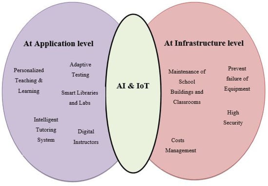 AI and the IoT play a vital role in optimizing and automating the education system at the application and infrastructure levels in smart cities. Home health monitoring and remote personalized learning are two roles of AI and the IoT that can be applied in smart cities’ sustainable education systems at the application level. IoT devices, such as laptops, tablets, and smartphones, provide remote learning and communication between students, teachers, and administrators. Moreover, machine learning algorithms are utilized to analyze data on student work and tailor instruction to individual student’s needs. For example, an AI system may be able to identify patterns in a student’s performance data, such as areas where the student struggles or excels, and adjust the instruction accordingly. Another approach is to use natural language processing to provide personalized feedback to students on their written work. Additionally, AI can be used to personalize learning through the application of adaptive learning systems, which calibrate the pace and challenge of instruction depending on how a student performs [32].