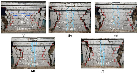 - The five walls in this study all had shear damage, with cracks extending along the mud joints. Eventually, the triangular area outside the main crack collapsed, and each wall collapsed after the widening of the oblique step of the main crack. The difference is that horizontal through-cracks formed in the middle area of the unrestrained adobe-masonry wall, while the middle areas of the composite walls with wood-structure center-column restraint were better preserved.
