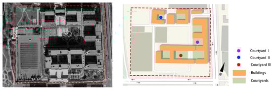 Samples: (a) Courtyard Ⅰ: large lawn, low density of shrubs and trees, a badminton court; (b) Courtyard Ⅱ: medium lawn, medium density of shrubs and trees, a hard-ground square with wooden benches; (c) Courtyard Ⅲ: medium lawn, high density of shrubs and trees, an antique pavilion.