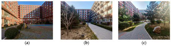 The China University of Mining and Technology (Beijing) campus covers nearly 34 acres in Beijing’s Changping District, with a total gross floor area of nearly 160,000 m2. There are 6 teaching buildings and 9 apartments for students and faculty. The property has 7 landscape courtyards, all of which are organized around teaching buildings and apartments (Figure 1). Most courtyards are surrounded by three-sided buildings, which is consistent with the situation of courtyards in high-density cities. The heights of the buildings around the courtyards are about 22 m, and the façades of the buildings are all of the same style, all of which are decorated with red bricks (Figure 2), which ensures the consistency of the courtyards’ landscape interfaces and helps to control the variables of the samples. Landscape nodes in the courtyards are abundant, the landscape types of the courtyards are diverse, and the layouts have obvious differences. It is appropriate to investigate and verify the differences in restoration performance and the influencing factors of different layout types of these courtyards.