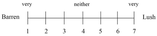 The method of semantic differential is a psychological measurement method introduced in 1957 by C.E. Osgood that uses semantics as a scale on which to conduct psychological experiments. It has analyzed indicators such as vision, hearing, and psychological emotions to describe the ideas and structures of an object [36]. The emphasis of the SD method is on considering the existing environmental information to determine the factor axis and setting the representative scale of the factor axis. Firstly, according to the behavior dimension and information dimension proposed by Kaplan [35], along with college students’ needs for environmental elements, three classifications were set: “Ornamental”, “Uniqueness”, and “Activity”. Secondly, under these 3 classifications, 17 items that were easily perceived by the subjects were selected as the factor axes, and 17 pairs of adjectives with clear and opposite meanings were further determined as the representative scales of the 17 factor axes (Table 1). Lastly, the assessment value of the representative scale of the factor axis was set to 7 grades, and the numbers were assigned correspondingly as 1–7 (Figure 4) based on the statistical requirements.