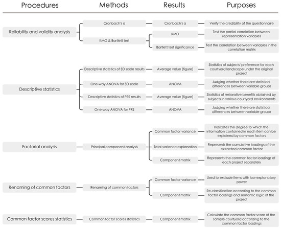 This study’s analytical framework was founded on the fundamental procedure of SD analysis, suggested by Zhuang Weimin et al. [42], which was mainly composed of five interrelated steps (Figure 5). In Step 1, the reliability and validity of the collected questionnaire data were analyzed to ensure the reliability and structural validity of the data. In Step 2, descriptive statistics were calculated based on the results of the SD scale and PRS, respectively, so as to preliminary characterize the subjects’ preferences for each courtyard and the restoration benefits obtained in the environments of the courtyard samples. In step 3, a factorial analysis was carried out using the SD method, and common factors were identified using principal component analysis. Step 4, by using the common factor variance and component matrix obtained in step 3 and analyzing the semantic logic of the original project, renamed the common factors extracted in step 3. In Step 5, according to the analysis results of the preceding steps, the shared factor scores of courtyard samples were statistically analyzed and compared to draw further inferences. All statistical analyses in this study were carried out by SPSS Statistics software R26.0.0.0 (IBM, Armonk, NY, USA).