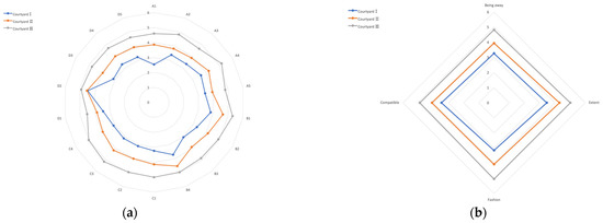 Based on the common factor score calculation for “Experience Quality”, the score trend of the samples was Courtyard Ⅰ < Courtyard Ⅱ < Courtyard Ⅲ, which shows that Courtyard Ⅲ can provide users with better experiences and details than Courtyard Ⅱ and Courtyard I.