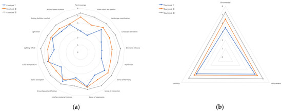 In terms of “color perception” and “lighting effect”, the average scores of Courtyard Ⅲ and Courtyard Ⅰ were quite different (the differences were 1.86 and 1.84, respectively). In the actual courtyard situation, the plant species in Courtyard Ⅲ were more abundant, and there was a colorful antique pavilion as a garden ornament, giving it a higher score for “color perception”. Additionally, the road form and space form of Courtyard Ⅲ were more complicated, and the trees and shrubs were staggered, providing it with a higher score in “lighting effect”.