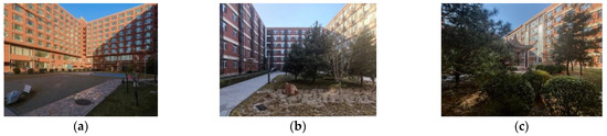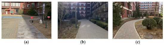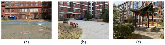 Through the statistical screening of the square meter areas and layout characteristics of eight courtyards, three courtyards with similar square meter areas but obviously different layout characteristics were finally selected as the experimental samples. Courtyard Ⅰ (1600 m2) is a courtyard attached to the student apartment. The plants are dominated by lawns, and shrubs are arranged around the courtyard. The courtyard has a badminton court, and the overall space is open (Figure 3a). Courtyard Ⅱ (1200 m2) is a courtyard adjacent to a student apartment. Lawns, shrubs, and trees are the most common vegetation varieties. The shrubs are organized along the road, and the trees are in clusters. There is a hard-ground square with wooden benches in the courtyard, and the overall space is regular (Figure 3b). Courtyard Ⅲ (1600 m2) is a courtyard adjacent to a teaching building, with a variety of plant types, including lawns, shrubs, and trees. Its layout is diverse and complex. There is an antique pavilion in the courtyard for rest, and the overall design is mysterious (Figure 3c).