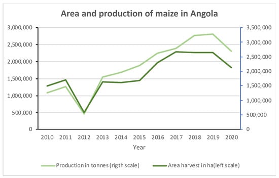 Area and production of maize in Angola during 2010–2020. Source: [56].