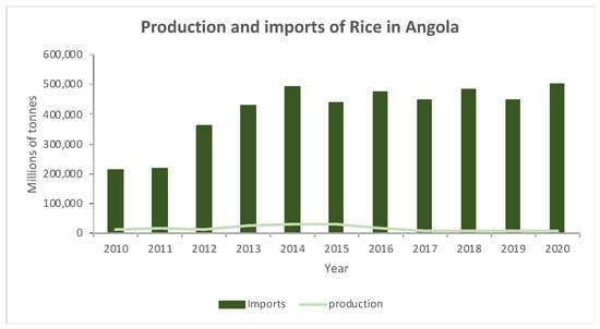 Production and imports of rice in Angola during 2010–2020. Source: [56].