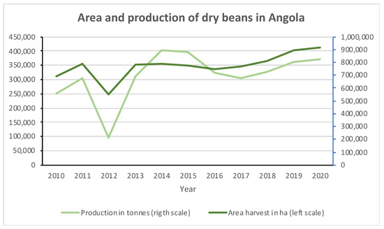 Area and production of beans in Angola during 2010–2020. Source: [56].