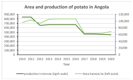 Area and production of potato in Angola during 2010–2020. Source: [56].