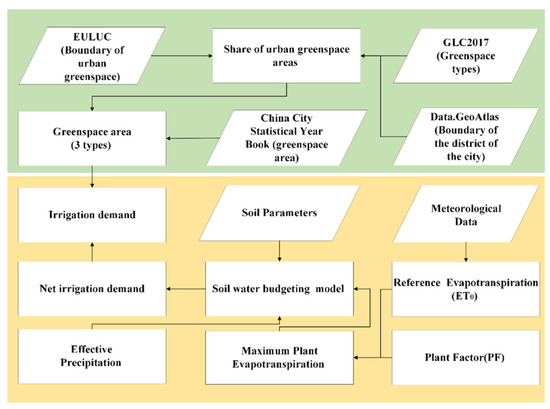 The net irrigation water requirement for green space was computed using and a soil water budgeting model, for each type of green space vegetation. Figure 1 illustrates the procedures of spatial data extraction and processing, as well as the steps to compute the net irrigation water requirement of urban green space. The volumetric irrigation water requirement was estimated according to the area of green space and net irrigation water requirement, for each type of green space in each of the 286 cities.