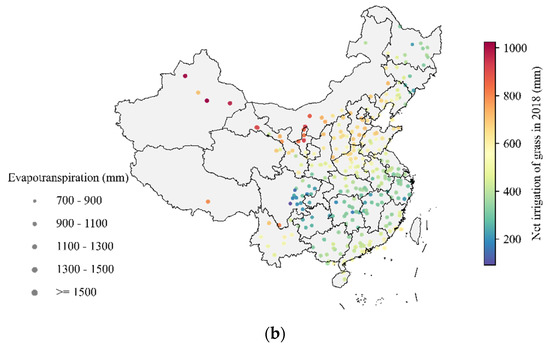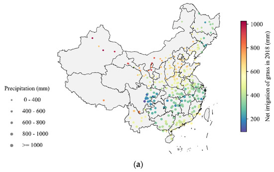 For all the prefecture-level and above cities in this study, the average reference evapotranspiration was 1239 mm/year, the average annual precipitation was 977 mm/year, and the average net irrigation water requirements for turfgrasses, shrubs, and trees were 476, 392, and 334 mm/year, respectively. Therefore, it is necessary to reasonably select the type and quantity of green space vegetation according to different uses and needs, so as to save water and protect water resources to the greatest extent. Figure 2 shows the spatial distribution of the net irrigation water requirement for turfgrasses under different precipitation and evapotranspiration in all cities. Most cities in Northwest China were located in dry regions, with the lowest annual precipitation of 370 mm, while the evapotranspiration of urban green space was very high, resulting in the average net irrigation water requirement of green space in these cities being very large. For instance, the average net irrigation requirement in Turpan and Karamay even exceeded 1000 mm/year. However, in East and South China, where the climate is humid, the average net irrigation water consumption of most urban green space was less than the average of 476 mm/year. This highlights the climatic control of water requirement for green space irrigation.