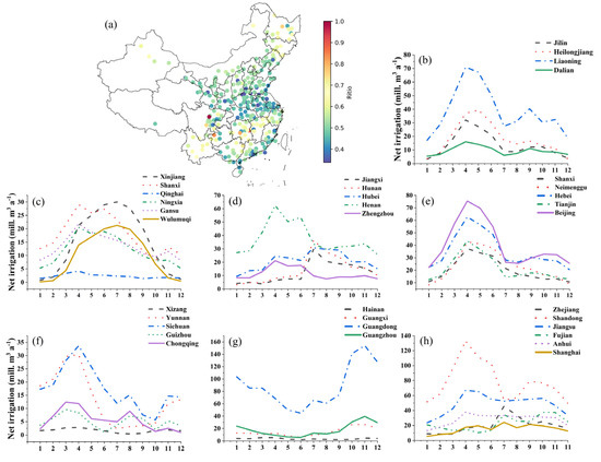 Monthly net irrigation water requirement in urban green space. The ratio of the largest value of total urban green space irrigation requirements in four consecutive months to that of average annual requirement of each city reflects the intra-annual concentration (a). The 31 primary administrative regions are distributed in seven major regions in China: East China (b), North China (c), South China (d), Central China (e), Northeast China (f), Northwest China (g), and Southwest China (h), ranked in descending order by built-up area. They accounted for 29%, 19%, 15%, 12%, 10%, 8%, and 6% of the total built-up area in the country, respectively.