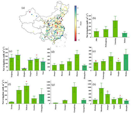 With the green space area of each city fixed at year 2018 level, we summarized the net irrigation water requirement of first-level administrative regions in seven geographical regions from 1986 to 2011, so as to explore the temporal and spatial characteristics of annual green space irrigation water requirement in cities in different regions. On the basis of the net irrigation water requirements from 1986 to 2011, we analyzed the trends of 286 cities at the prefecture level and above in China. It is worth noting that these trends were exclusively climate-driven because the green space data were fixed at the 2018 level. In the nonparametric Mann–Kendall test, the trend of net irrigation water requirement for each city from 1986 to 2011 was calculated, and Sen’s slope value was calculated, as shown in Figure 4.