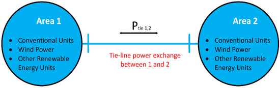 Dual-area power systems are connected by a tie line as shown in Figure 2, implying that both frequency and tie-line power regulation is required to ensure that the whole power system operates as designed and intended. Each area is equipped with many generators that are tightly connected to create a coherent group, guaranteeing that all generators in the power system respond in unison when the demand varies. During normal operation, the tie-line power for a dual-area system is calculated by the authors in [55,56]. Moreover, several studies have examined an overview of LFC systems in dual-area power systems and tie-line models, as well as their impacts on LFC systems that have been thoroughly investigated [16,20,26,54]. Multiple operating scenarios of the LFC of a dual-area power system comprised both thermal and wind turbine generators were explored using recurrent ANN and adaptive fuzzy control approaches [26]. Additionally, the authors in [16] introduced a modified fractional-order PID (FOPID) controller for wind energy and EVs based on two-area power systems. The cross-area power balance between demand and supply is more difficult to achieve, and it has an adverse effect on frequency stability and reduces auxiliary frequency control capabilities. To address the secondary frequency control issue in a deregulated dual-area power system, an enhanced SMC was developed that minimizes the optimum values of the objective functions while simultaneously requiring less computational effort [54]. Similarly, the authors in [20] compared the LFC capabilities of ANFIS, ANN, and fuzzy controllers, and their results indicate that the ANFIS controller improves dynamic response, including efficient execution, reduced fault magnitudes, and a lower transitory frequency. Additionally, several optimization strategies have been examined for the LFC problem in a dual-area power system in order to enhance the PID controller settings [57]. Reference [58] proposed using a tilt PID controller to regulate the frequency of traditional two-area deregulated power systems that also incorporate WTGs, EVs, and hybrid energy storage.