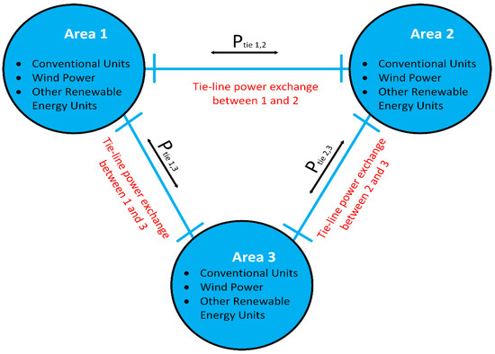 These systems employ tie lines to interconnect the three control zones as depicted in Figure 3, each of which has a different combination of power generation resources and loads to control. As the control area associated with the fault level current expands, a more robust set of control mechanisms is needed to prevent disturbances from propagating. For a three-area wind-integrated power system, the and area control error (ACE) were determined [55,56]. Moreover, several studies on LFC modelling for three-area connected power systems have been found in the literature. Ref. [59] presented an LFC technique based on RES integration and a novel algorithm for optimizing the parameters of a conventional PID controller. Assuming all of the system’s parameters have been adjusted to their nominal values, an LFC technique based on a full-order adaptive SMC has been developed [60]. The uncertainty associated with the parameters was not addressed in this system. Using a hybrid H2/H∞ controller, the parameter uncertainties and response latency of EVs to participate in multi-objective LFC with conventional sources were studied [22]. However, this technique does not provide an acceptable conclusion for voltage transients or any other constraint since the load is not scheduled during peak hours. Using the differential evolution (DE), the authors in [61] developed a resilient FOPID controller for a three-area power system that considers peak undershoots, convergence speed, and physical constraints. In a dynamic setting, the mathematical models of an unequal triple-area system with a diverse variety of energy resources, including wind energy, have been studied, and the results have been published [62,63]. The LFC of a composite power system that comprises thermal, solar, and EVs were studied, and an integral-double-derivative (IDD) controller was applied to assess the system performance [64].
