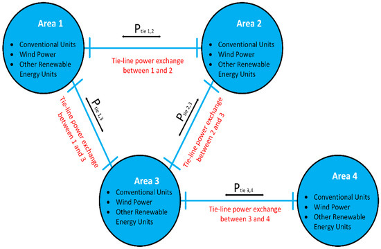 In general, four-area power systems that are coupled by tie lines are separated into four regions, as illustrated in Figure 4, to maintain the frequency fluctuation within an acceptable range. The LFC model of four-area integrated power systems has been described by the authors in [51,65,66,67]. The initial design for a four-area LFC system using the generalized technique incorporated non-linear systems and dual controllers. On the other hand, as power systems become more complex and diverse, much research has been conducted on four-area integrated contemporary power systems with the goal of improving overall system performance [28]. The mathematical model for frequency regulation of wind-integrated power systems was investigated by the authors in [51]. The LFC model was investigated in a four-region design with identical reheated thermal units [68]. The formulation of the problem and the constraints associated with this model have been analyzed. Using a customized variant of the bat algorithm (BA) in conjunction with fuzzy logic, it is possible to obtain the optimum outputs of a traditional PI controller used for LFC in four-area systems [69]. However, unstable optimization outcomes and the tendency to slip into local optimums are some of BA’s shortcomings. While such algorithms provide the best coefficients, they are expensive and time intensive to apply, necessitating the use of cluster analysis and parallel computing to achieve the intended results.