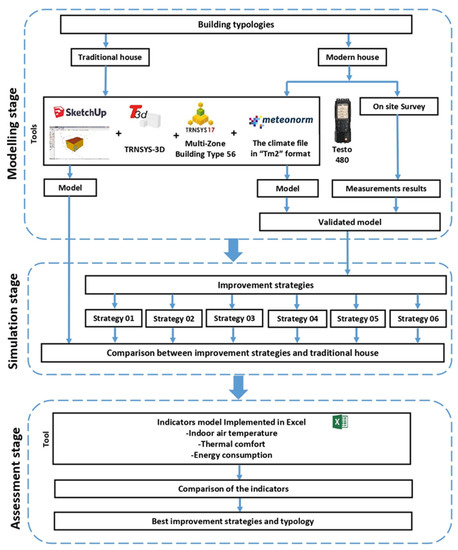The methodology followed in this study to assess the impact of passive strategies on thermal comfort and energy consumption in the selected houses was divided into three stages: (1) modeling stage; (2) simulation stage; and (3) assessment stage (Figure 1).