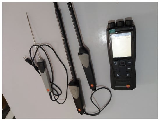 Figure 2. Equipment used in the measurement campaigns (Testo 480). - Model creation: The analysis of the improvement in thermal comfort and energy consumption by dynamic simulations was performed using TRNSYS17 software. TRNSYS 2017 is a software program originally developed by the University of Wisconsin in the 1970s for the numerical analysis of solar energy for heating and hot water [41]. The geometry of the model for the case study was created through exploitation of the software «Sketch-up» using the plugin «Trnsys-3D», and then the file was exported to the TRNSYS software in .idf format, as shown in Figure 1. The living room of the modern house (base case) was a cube of 4.20 × 3.90 × 3 m, and 3.93 × 4.95 × 2.70 m for that of the traditional house. The two houses were modeled with a unique thermal zone, with a window facing south, and without any internal or external solar protection. The south wall was considered as the exterior wall, whereas the other walls were characterized as “boundaries” or walls with known boundary conditions (TRNSYS 17). The studied façade was the one facing south (the façade most exposed to solar radiation with the most unfavorable conditions) [42]. The simulation was limited to the living room area because it is the busiest living space, where the family gathers. The TMY (typical meteorological year) climate file was generated for Ouargla City using «Meteo-norm V7.2» software in Tm2 format for «Type 15-2 Weather data». In Table 2, the input parameters of the simulation model are shown; specifically, the following data were reported: dimensions, envelope properties, the plans of the thermal systems, and professional profiles. In addition, in Table A1 and Table A2 of Appendix A, the thermal properties of the materials used in the reference building are included. After the creation of the materials library in TRNSYS, a detailed scenario encompassing all of the parameters (infiltration, internal gains, the number of people and their activities, and possible equipment) was generated. According to the most realistic occupation scenario for the inhabitants, it was set that the inhabitants dress in traditional clothes (the thermal resistance of the clothing was set at 1.5 clo [43]) and occupy the living room in a state of rest and in a sitting position (metabolic activity was theoretically fixed at 1 met [43]). The most realistic occupancy scenario, considering an occupancy of six people in the base case and five people in the traditional house, is shown for each dwelling in Appendix A, Figure A1, with an occupancy schedule of 24 h having been set. The other internal gains were due to the equipment (5 W/m2; TV and electric lighting) found in the living room. To estimate the energy needs, temperature set points were determined for the operation of the thermal plants in the winter and summer, namely, 17 °C for heating and 27 °C for cooling, respectively. In order to avoid errors in the simulation’s initialization, we ran the simulation for a year. The simulation time step was set to one hour, and we exported the results in .xls format. Subsequently, we produced graphs for the hottest and coldest periods according to the utilized climate file.