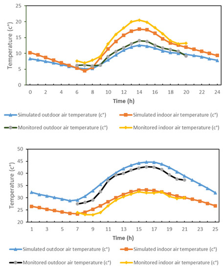 - Model validation and calibration: Before studying the different passive improvements, we validated the model of the modern house in the current situation (base case) by comparison of the simulated temperatures (outdoor and indoor) with the on-site measurement results, as shown in Figure 3.