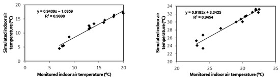 The model was calibrated by inserting the measured outdoor air temperature values as input data in the simulation and comparing the internal temperatures (measured and simulated). In order to calibrate the model and to obtain a higher R-square value, the internal gains were adjusted, because among the input parameters, they represented those with the higher level of uncertainty. During the winter and summer periods, correlation coefficients (R2) equal to 0.9698 and 0.9454 were obtained, respectively. These results can be considered satisfactory for the validation of the numerical simulation results. Indeed, a correlation coefficient (R2) between 0.90 and 1.00 indicated a very strong correlation. The graph below summarizes the validation of the numerical simulation model during the summer and winter seasons.
