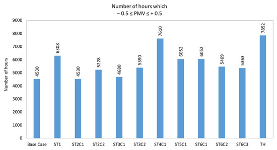 During a period of one year, we obtained the PMV index values for the different scenarios. In Figure 5, for each studied scenario, the number of hours in which the PMV fell inside the range between −0.5 and +0.5 is shown. Such a range corresponds to a PPD index less than or equal to 10%, i.e., the percentage of occupied hours during which 90% of people were satisfied with their thermal environment perception.