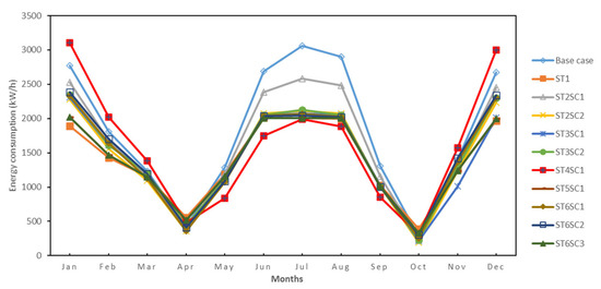 In Figure 7, the annual overall energy demand is shown for the base case and for all the simulated scenarios. From this figure, it can be observed that in the summer, the best scenario was the ST4SC1, while the worst was the base case; in winter, the best scenarios were ST1, ST6SC3, and ST3SC1, while the worst scenario was the ST4SC1.