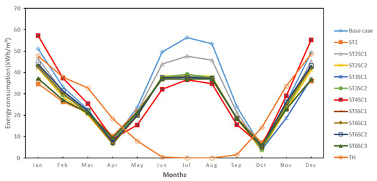 We compared the energy consumptions of all simulated scenarios with those of the traditional house. From Figure 8, a curved line of energy consumption in the TH during the months of June, July, and August can be observed. That line tends to zero kWh/m3, which is due to the absence of cooling systems in the TH. On the other hand, with the use of heating systems, the traditional house showed the highest energy consumption per volume during the months of February, March, April, October, and November.