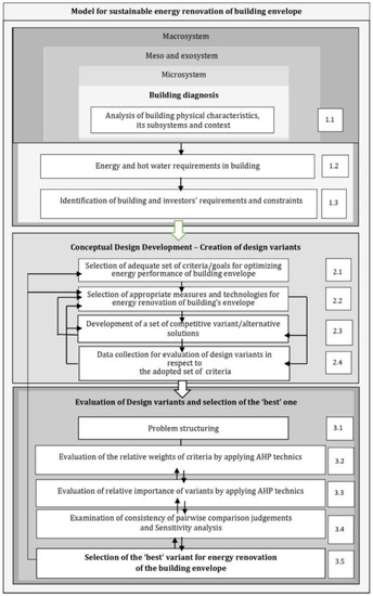 An iterative procedure was adopted for the process of designing alternative solutions, keeping in mind the complexity of the problem and the need to strike a balance between mutually competing requirements in terms of function, energy performance, aesthetics, cost-effectiveness, and environmental concerns. The established procedure is presented and discussed in detail in Section 3, while in Section 4, the proposed model is applied to solving a real problem—the ESR of the envelope of a residential building in the suburb of ‘Konjarnik’, in Belgrade, Serbia, dating from the period after the Second World War. Each step of the proposed model is systematically presented and explained. The concluding remarks about the proposed methodology and its applicability are given in Section 5.