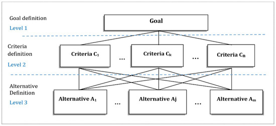 To correctly apply the AHP methodology, the first step in this phase (step 3.1 in Figure 1) is to decompose a concrete problem into levels, each with a set of hierarchically controlled elements (criteria, sub-criteria, and alternatives) in a top-down direction, allowing their evaluation in pairs with respect to the element directed at a higher level [84]. The AHP keeps all parts of the hierarchy in a relationship, making it clear how changes in one element affect the other elements. Figure 2 illustrates the general structure of the problem for selecting the ‘best’ alternative.