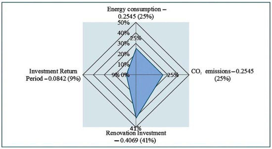 Given that the study considers the initial phase of the renovation project, i.e., ‘Development of conceptual solutions and preliminary feasibility studies’, the initial decision about the initiation of the project is made by only one decision maker—the apartment owners. After reviewing the feasibility study, which includes conceptual solutions/alternatives, initial project costs, energy savings, investment payback period, project implementation time, etc., an informed decision is made about whether to proceed with the project. In the case of a positive decision, the opinions of the other above-mentioned decision makers on the weight structure of the criteria are taken into account, and comparison matrices of criteria are formed. In this stage, introduction of new criteria is also considered in order to satisfy all the necessary requirements of other decision makers and ensure the financial support of the project.