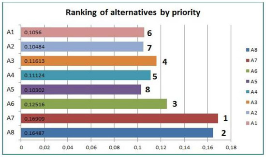 In the final stage of the evaluation process (step 3.3 in Figure 1), numerical priorities are calculated for each of the alternative decisions. The relative ability of the alternatives to achieve the decision objective is thus numerically expressed [84] and the alternative with the highest value represents the ‘best’ alternative according to the adopted set of criteria and the decision maker’s priority system, which is reflected in criteria weights (step 3.4 in Figure 1). Since the comparisons are undertaken using a subjective approach, some inconsistency may occur. To ensure that the judgement is consistent, the consistency ratio (CR) should be calculated, which will show the consistency between the pairs compared. The consistency ratio (CR) is determined by the ratio of the consistency index (CI) to the random index (RI) [79,83]. Its calculation is explained in detailed in [77]. If the consistency ratio CR < 0.1, the comparison matrix is consistent. Saaty in [79,83] suggests that if CR exceeds 0.1, the set of judgments may be too inconsistent to be reliable. A consistency ratio of zero implies perfectly consistent judgements.